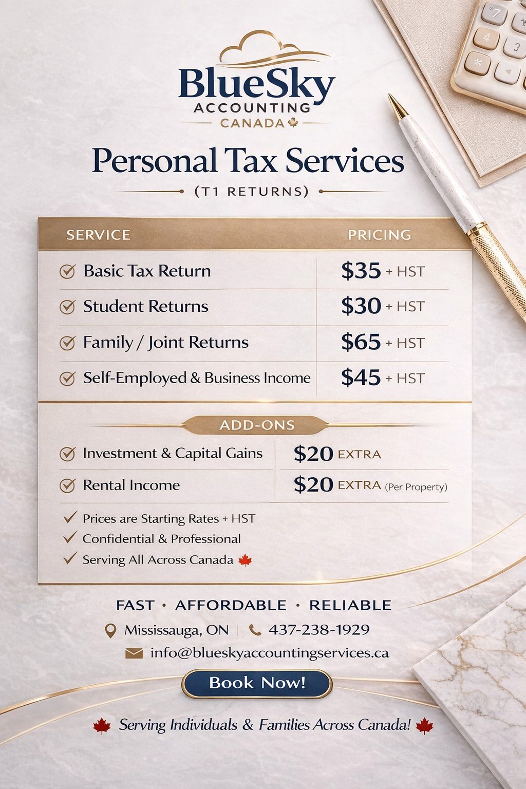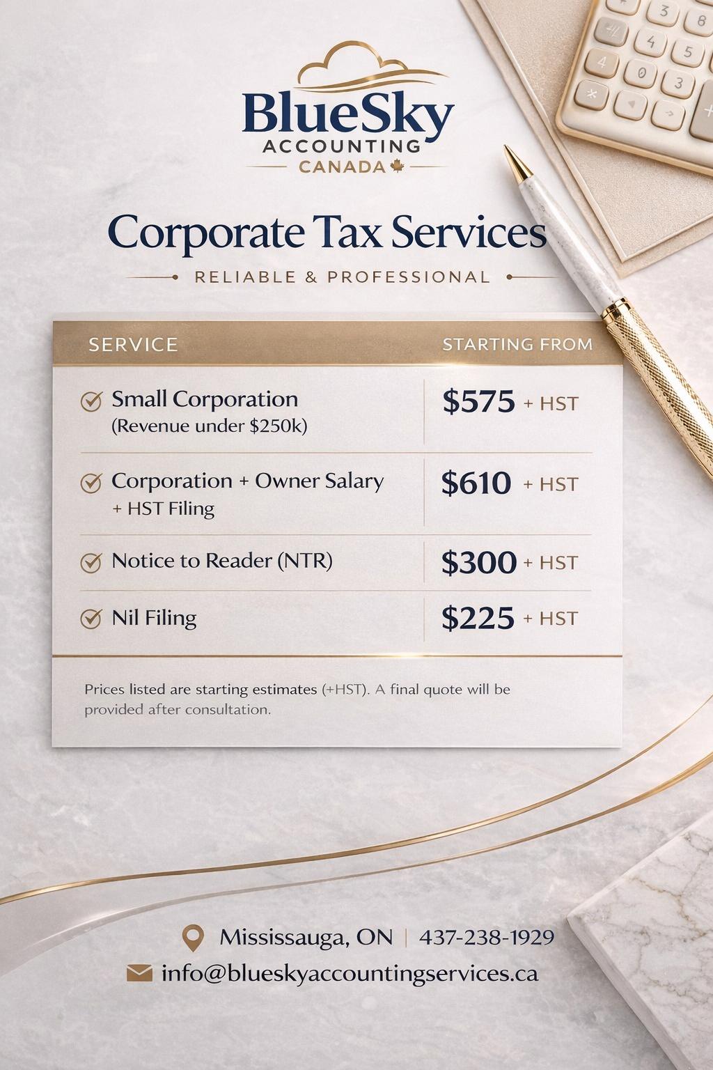 We understand that tax and bookkeeping costs can add up — especially for small businesses and self-employed professionals. Our pricing is designed to be fair, transparent, and below typical market rates, while still delivering high-quality, compliant, and professional service you can trust.
